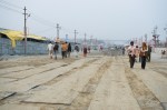 We arrive at night. The scene is surreal – dusty, beige monochromatic dotted with electric lights lining the roads – all ‘temporarily’ constructed on the silty banks of the rivers (the Ganges being the dominant one). Monsoon season floods immense sections of land leaving behind in the dry season a perfect flat plain on which to build the Kumbh. Well, not so perfect as I notice tens of thousands of 3×6 foot iron plates bolted together in parallel lines making all the roads in this massive complex. Without them, no type of transport can deliver the building materials, food, fencing, etc.  Next, water. Yes, I know there are rivers but still the water must be piped into the interior. I wonder about sewage but after visiting a makeshift toilet shed – basically a shallow hole with two bricks to step on, I decided not to go down this path of thinking about 100 million pilgrims pooping and peeing. I am just grateful for my tent camp with my own makeshift ‘flushing’ toilet.