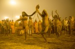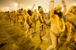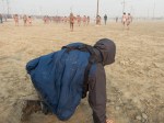 As we approach the river, we find a little corral where all the foreign press are staged. They are squeezing together like sardines to get that ever so famous shot of the Nagas taking the first plunge in National Geographic! Our own young guide sheepishly asks me I’d I would watch his clothes so he could participate in his first Kumbh. Quite poignant! Wave after wave of naked Nagas go by, running, jumping for joy – eager to get in and just as eager to get out of the freezing water. One amazing sight was watching them warm up by doing yoga, head stands, calisthenics and contortions of all types.
